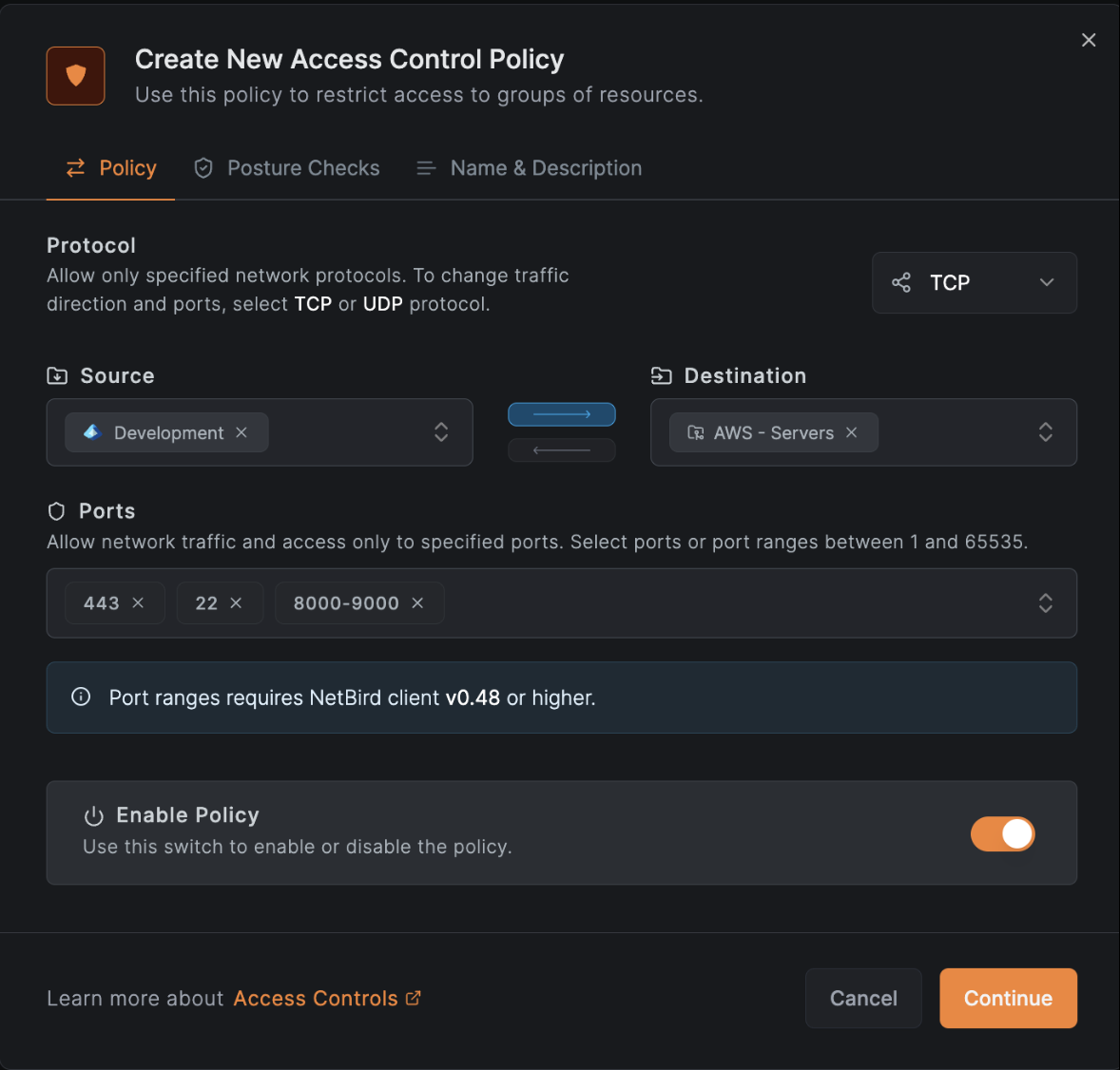 NetBird now supports port ranges in access control policies. This new capability dramatically reduces the manual overhead of listing every single port for applications that require a wide range of them; simply define a port range (e.g. 8000-9000) in a single policy. This not only makes firewall and access rule configurations cleaner and more manageable but also improves security posture by making it easier to implement the principle of least privilege.