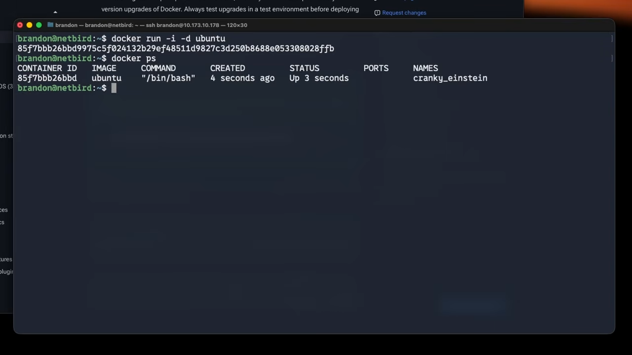 Then, we can run an Ubuntu container with an interactive session using the argument. Since the image is already pulled, this container will start automatically.