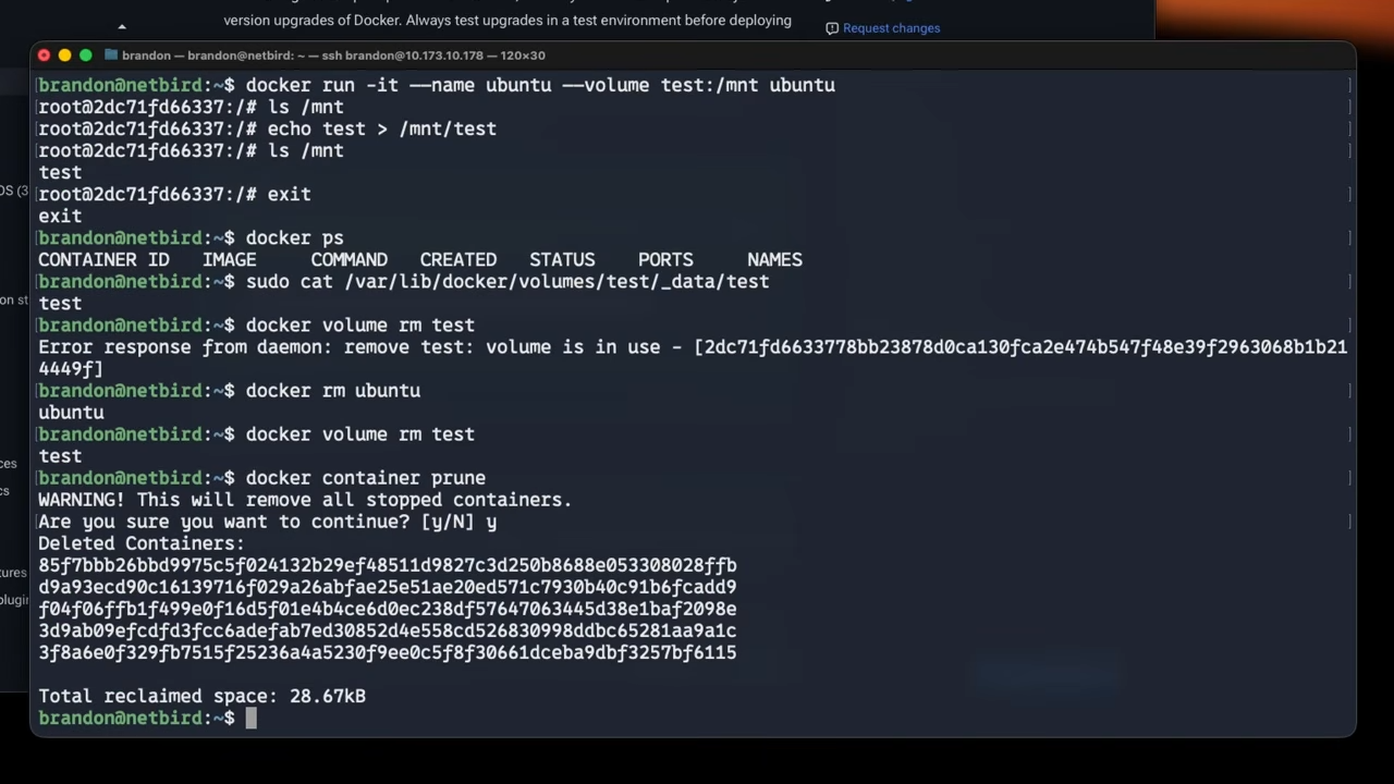In this case, the volume is in use. You can see the last few containers if you list all stopped containers. The volume is associated with the Ubuntu container, so the volume must be removed first. You can remove a single container with , or remove all stopped containers with a prune command:
